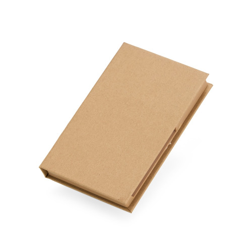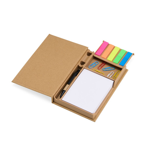 Descrição: Tudo em seu lugar, prontinho para as anotações! Nosso Bloco de Anotações Ecológico é perfeito para manter a organização enquanto se registra ideias. Feito de material kraft, ele vem com 100 folhas brancas para anotações, 5 marcadores autoadesivos coloridos para destacar o que é importante, 7 clips guardados em uma gavetinha prática e uma mini caneta de papelão com carga esferográfica azul. E ainda conta com espaço para armazenar a caneta e dois suportes porta-caneta, garantindo praticidade no dia a dia. Este bloco é tudo o que o seu cliente precisa para dias repletos de anotações.