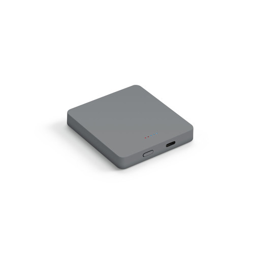 Bateria portátil de carregamento rápido em ABS 100% reciclado com acabamento em mate. A bateria leve em lítio e com design slim, tem uma capacidade de 5.000 mAh e tempo de vida ≥ 300 ciclos. Esta bateria portátil torna-se muito prática para o dia a dia uma vez que permite, através do seu magnetismo, prender atrás dos smartphones ou capas com este sistema. Possui entrada/saída USB-C e potência máxima de 15W para carregamento rápido sem fios. Compatível com smartphones com tecnologia de carregamento sem fios. Incluso cabo USB-C para carregamento rápido. Fornecido em caixa presente de papel kraft. 74 x 69 x 15 mm | Caixa: 77 x 18 72 mm