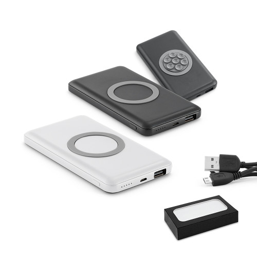 Bateria portátil e carregador wireless. Alumínio. Bateria polímero de lítio. LED: indicador de carga. Capacidade: 4.000 mAh. Entrada 5V/2A e saída 5V/2A. Potência de carregamento: 5W. Incluso cabo USB/micro USB para carregar a bateria. Fornecido em caixa presente. 126 x 71 x 14 mm