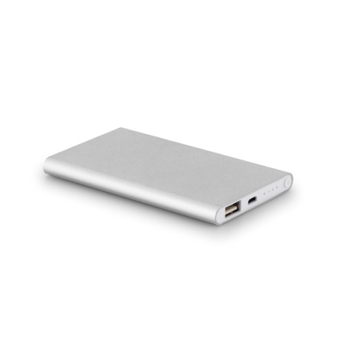Bateria portátil slim. Alumínio. Bateria de lítio. Capacidade: 4.400 mAh. Tempo de vida ≥ 500 ciclos. Com entrada/saída 5V/1A. Incluso cabo USB/micro USB para carregar a bateria. 110 x 68 x 10 mm
