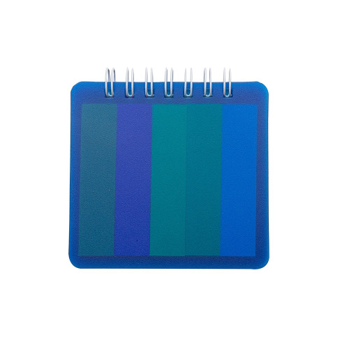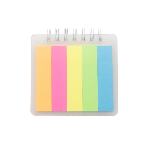 Descrição: Bloco de anotações plástico com autoadesivos. Bloco com wire-o branco, contém cinco blocos autoadesivos coloridos com aproximadamente 25 folhas cada e bloco amarelo com aproximadamente 25 folhas.