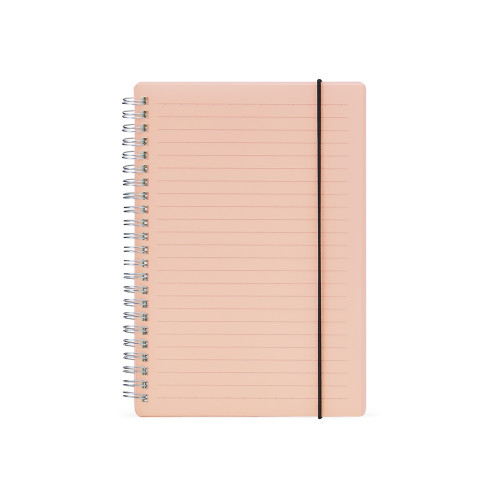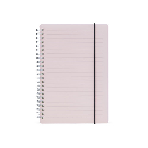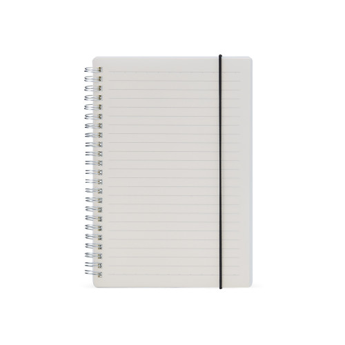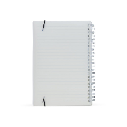 Descrição: Caderno A5 com capa plástica e elástico para lacre, contém aproximadamente 80 folhas marfim com pauta.