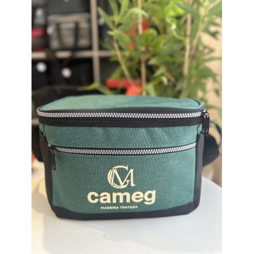 Descrição: Bolsa térmica 10 litros com bolsos externos, contém bolso frontal com zíper, bolsos laterais telados e alça transversal regulável com apoio para ombro.