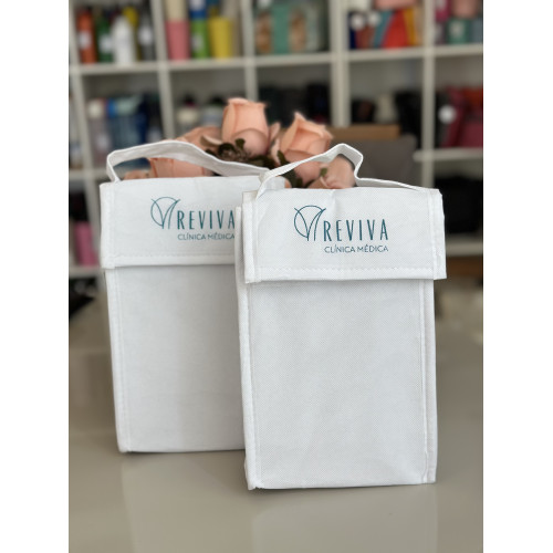 Bolsa térmica dobrável. Non-woven: 80 g/m². Fecha com velcro. Fornecida desdobrada. Capacidade até 3 litros. Food grade. Dobrada: 170 x 95 x 40 mm | Aberta: 170 x 265 x 110 mm
