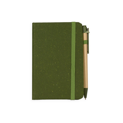 Descrição: Caderneta ecológica de capa dura revestida em fibra de palha de trigo. Contém aproximadamente 80 folhas brancas com pauta, além de duas folhas de guarda, uma fita para fechamento e porta-canetas elástico. Acompanha uma caneta esferográfica de carga azul de 1,0mm com corpo em papelão e clip, acionamento por clique e ponteira em plástico.