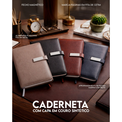 Descrição: Caderneta com capa em couro sintético, fecho magnético, além de marca-páginas em fita de cetim. Possui aproximadamente 96 folhas marfim com pauta. Acompanha plaquinha fixa em metal.