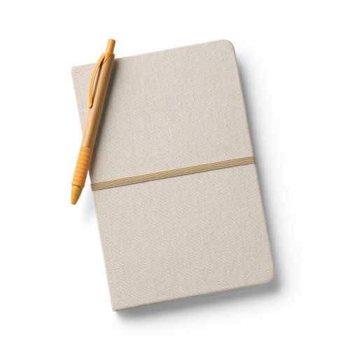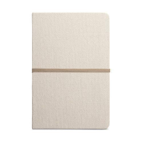 Caderno capa dura. Linho 230 g/m². Cantos redondos. 96 folhas pautadas. 140 x 210 mm