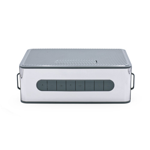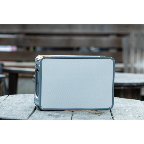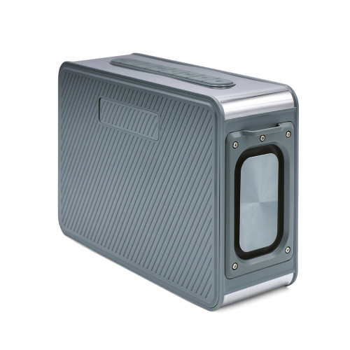 Caixa de som em ABS 100% reciclado com 80W de potência. A capacidade da bateria é de 5.200 mAh, o que permite uma autonomia aproximada de 7h. Tem equalizador com 3 modos, transmissão BT 5.3, entrada e saída AUX e permite ligar microfone externo ou guitarra diretamente. Possibilidade de emparelhar duas caixas de som Jouncer para efeito stereo. Incluso carregador e uma alça para transporte da caixa de som ao ombro. Fornecido em caixa presente de papel kraft. A grelha é fornecida solta para pedidos não personalizados. 293 x 198 x 105 mm | Caixa: 330 x 309 x 147 mm