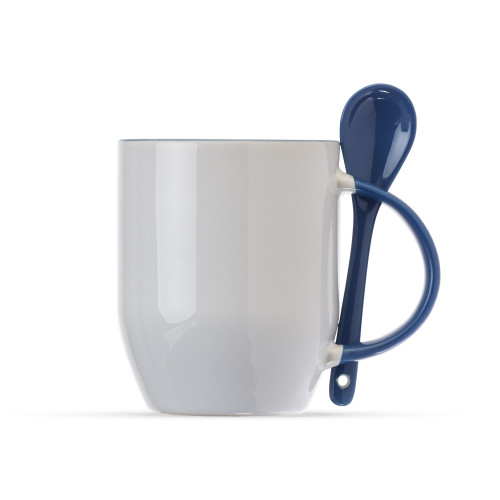 Descrição: Caneca de cerâmica 350 ml acompanha colher. Caneca branca com parte interna colorida, cabo colorido com detalhe vazado na parte superior, para encaixar colher. Acompanha colher cerâmica colorida com detalhe vazado no cabo.