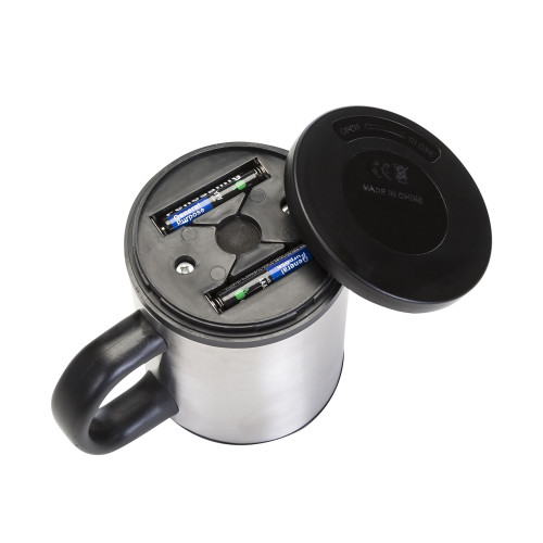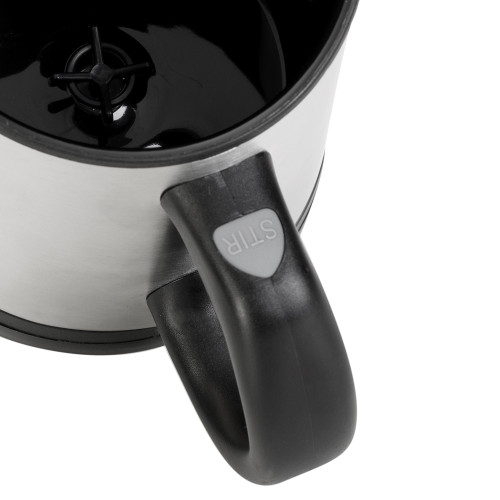 Descrição: Caneca mixer 400 ml em inox, possui detalhes em plástico resistente preto(inclusive a parte interna).Tampa rosqueável e com uma abertura para poder ingerir o líquido, parte inferior está o compartimento onde é colocado as pilhas(2 AA), basta rosquear. Para funcionamento basta apertar o botão “STIR” no cabo da caneca e a válvula interna irá começar a girar.