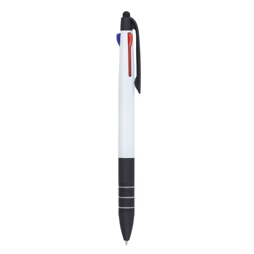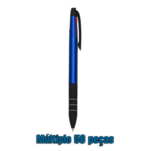 Descrição: Caneta plástica três cores e ponteira touch, corpo colorido com detalhes emborrachados. Possui as cargas azul, preto e vermelho(basta descer o suporte colorido pra acionar a cor). Clip emborrachado e touch superior, possui três anéis cinzas na parte inferior.