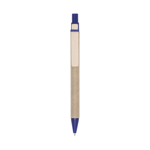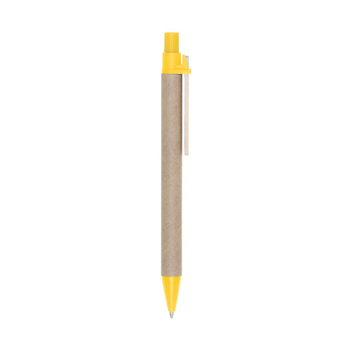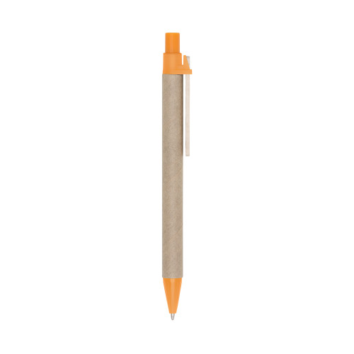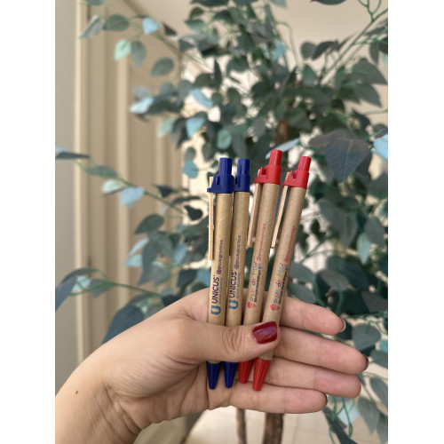Descrição: Caneta ecológica de papelão com detalhes coloridos. Clip de madeira e ponteira plástica, possui relevo na ponteira. Aciona por clique.