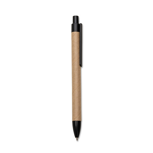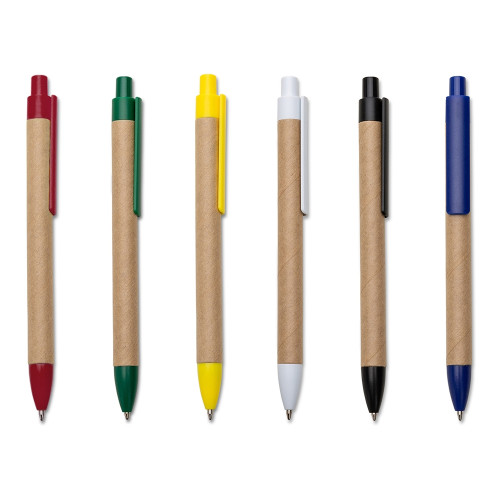 Descrição: Caneta ecológica de papelão com detalhes coloridos. Além do amplo espaço para personalização no clip, o mesmo pode facilmente ser retirado para personalização no corpo da caneta. Clip e ponteira plástica, aciona por clique.