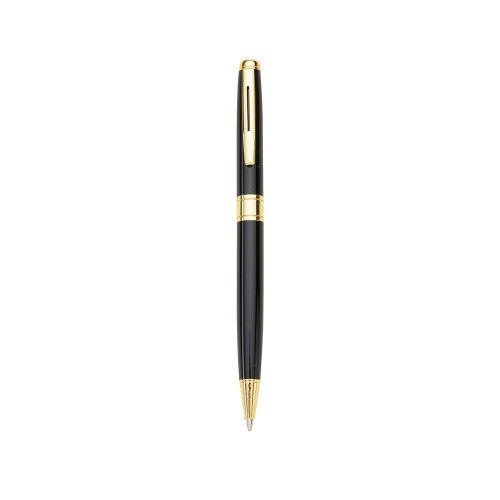Descrição: Caneta metal esfero preta com detalhes em dourado, possui clip metálico com detalhe central vazado. Aciona por giro.