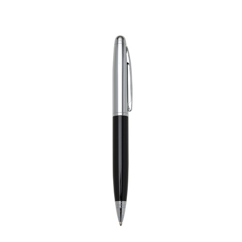 Descrição: Caneta metal inteira colorida com detalhes prata. Clip metal com quatro anéis em relevo na “ponta”, anel prata central e quatro anéis em relevo na ponteira. Aciona por giro.