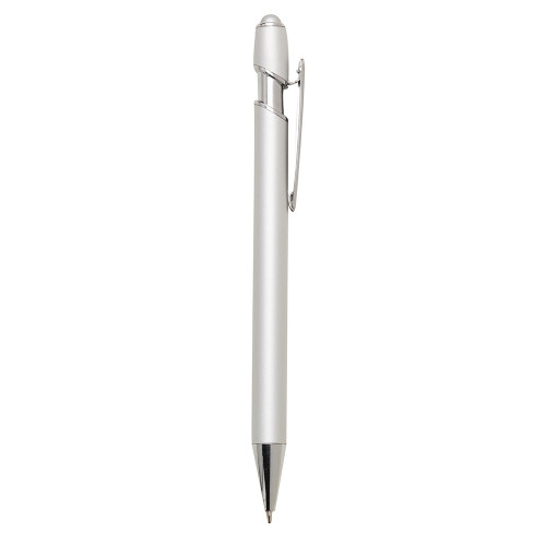 Descrição: Caneta metal com ponteira touch. Corpo com pintura prata fosco, acionador com borracha touch e clip metálico com detalhe brilhante. Aciona por clique.