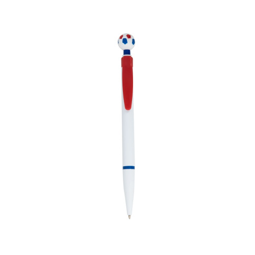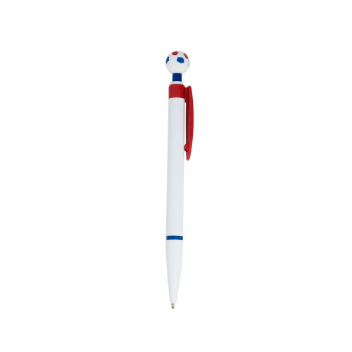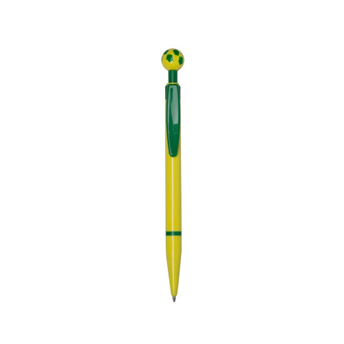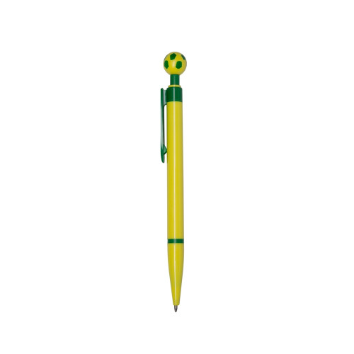 Descrição: Caneta plástica amarela com detalhes verdes. Possui bola de futebol no clip, parte inferior com anel verde. Aciona por clique.