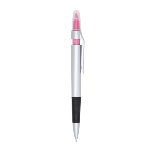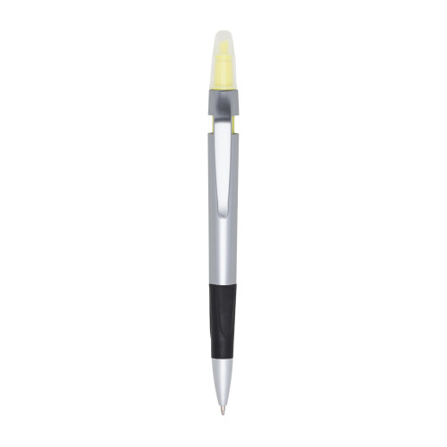 Descrição: Caneta plástica esferográfica e marca texto com corpo prata. Possui tampa protetora no marca texto e detalhe emborrachado com relevo na parte inferior. Aciona por clique.
