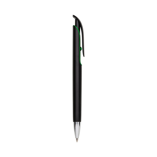 Descrição: Caneta plástica na cor preto fosco com detalhe colorido ao redor do clip, ponteira prata. Aciona por clique.