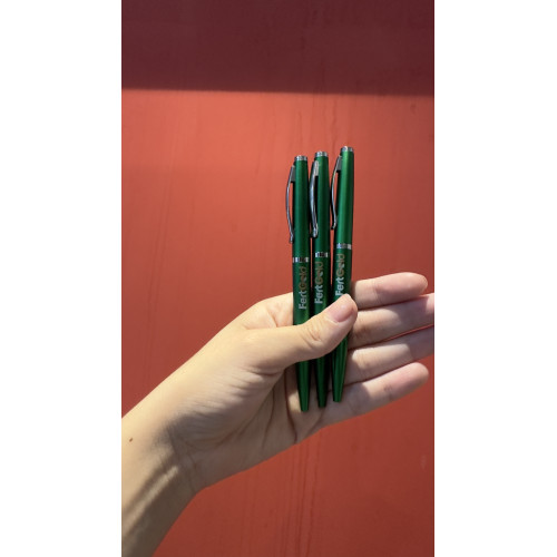 Descrição: Caneta plástica com design fino, corpo colorido e detalhes em prata. Possui o clip em metal e parte inferior com relevo, aciona por giro.