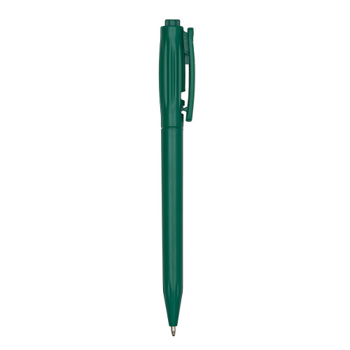 Descrição: Caneta plástica fosca inteira colorida. Possui detalhes em relevo na parte superior ao redor do clip, parte inferior com detalhes em relevo. Aciona por clique e para destravar basta apertar a parte inferior do clip. Possui carga esferográfica azul.