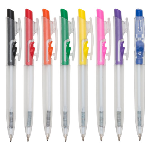 Descrição: Caneta plástica translúcida com detalhe colorido. Aciona por clique e para destravar basta apertar a parte inferior do clip.