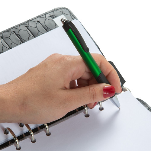 Descrição: Caneta plástica colorida com detalhes preto. Clip plástico preto e acionador prata, parte inferior possui detalhe emborrachado com relevo. Aciona por clique.