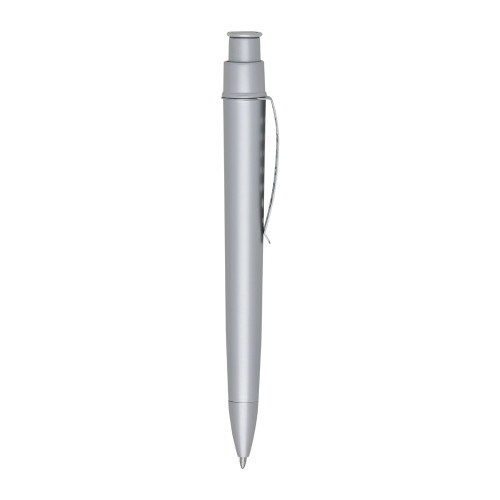 Descrição: Caneta plástica fosca inteira colorida com detalhes prata. Clip de metal com doze furos, aciona por clique.