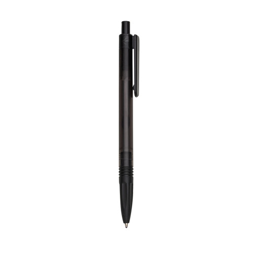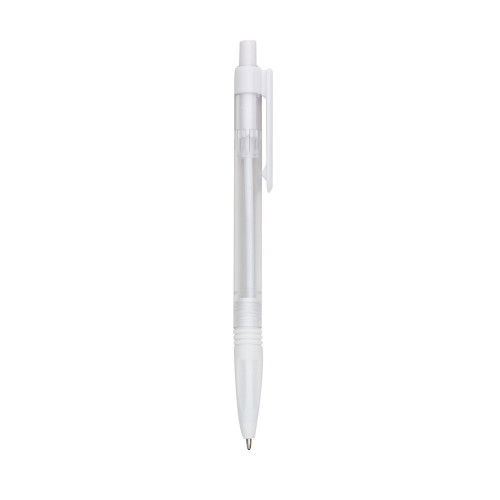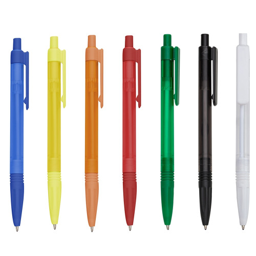 Descrição: Caneta plástica transparente colorida, possui três aneis inferiores, ponteira com detalhe em relevo e acionador todos leitosos. Aciona por clique.