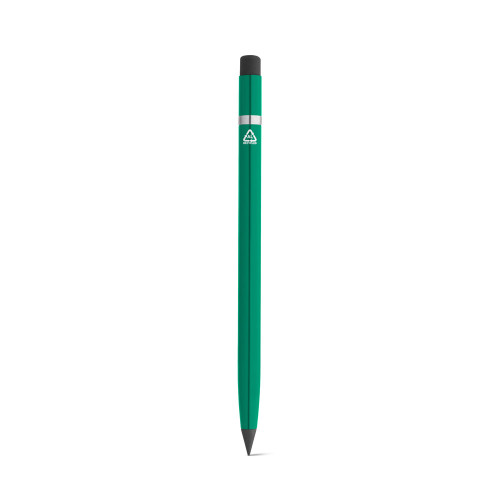 Caneta sem tinta em alumínio 100% reciclado, com tampa protetora em PE reciclado. Apta para um uso prolongado sem a necessidade de apontar. Na parte superior contém uma borracha que apaga com facilidade o que está escrito. ø8 x 150 mm