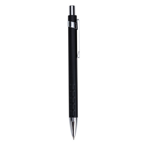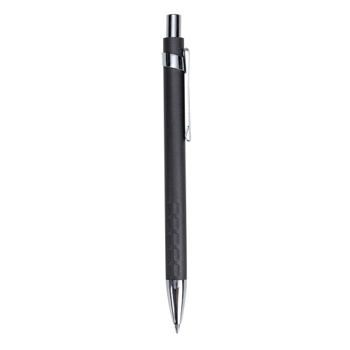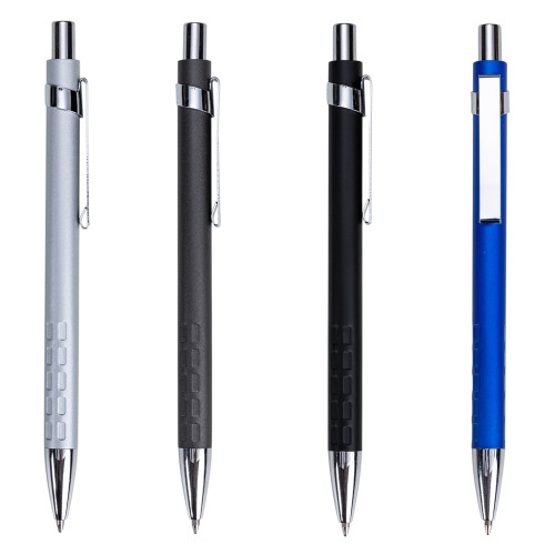 Descrição: Caneta metal com detalhes retangulares na parte inferior em relevo. Corpo colorido com pintura fosca, acionador e clip prata espelhado, aciona por clique.