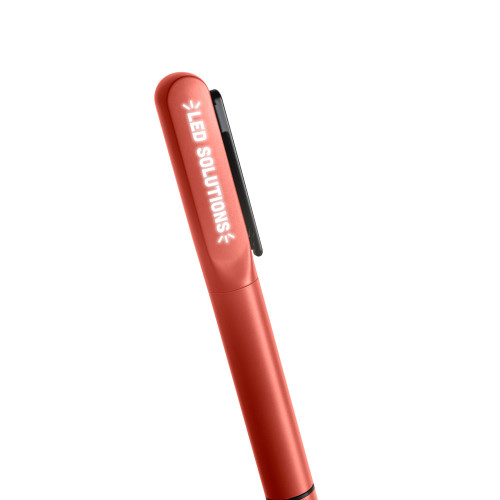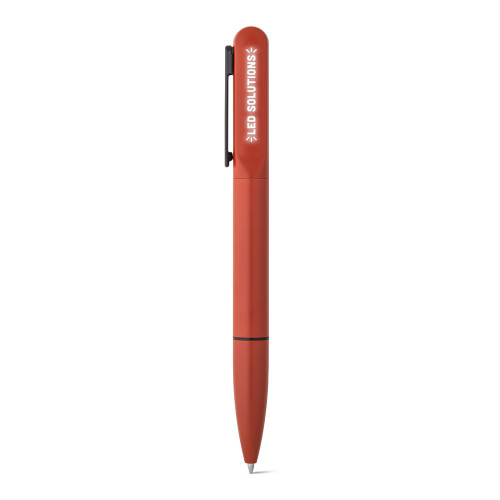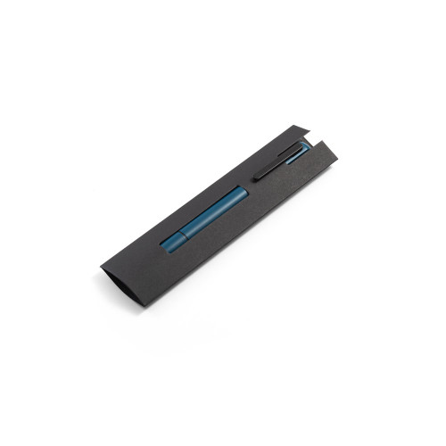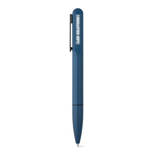Esferográfica em alumínio 94% reciclado e escrita em azul. Quando personalizado no clipe permite que ao ser rodado ilumine o seu logotipo ou personalização. Fornecida em bolsa de oferta. ø12 x 140 mm