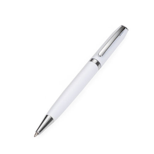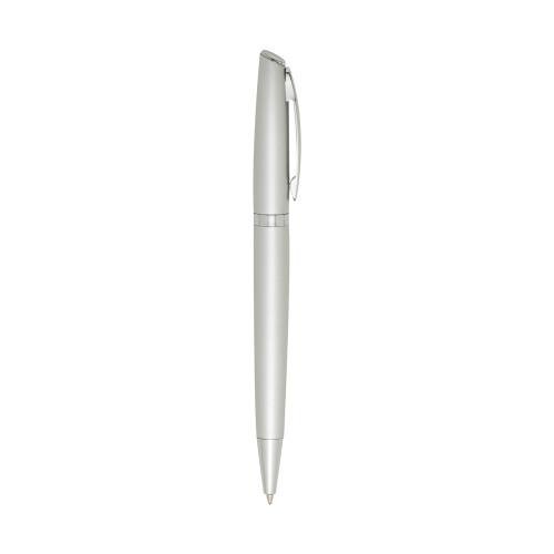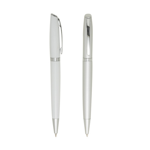 Descrição: Caneta metal inteira colorida e detalhes em prata. Clip metal, possui parte superior e anel central em prata. Aciona por giro.