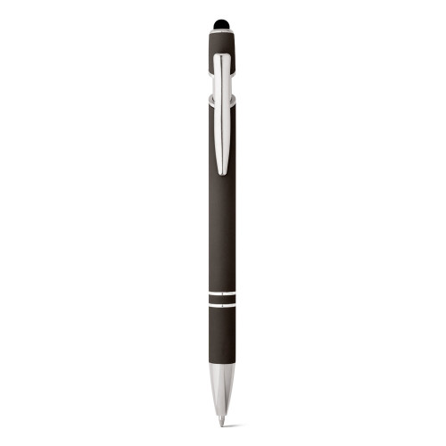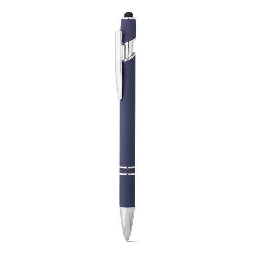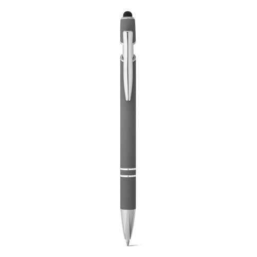 Esferográfica em alumínio com acabamento emborrachado. A esferográfica tem escrita em azul, ponteira touch no topo da esferográfica e clipe de metal. ø10 x 143 mm