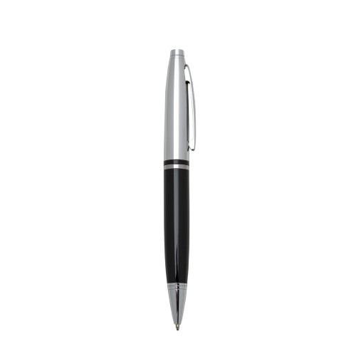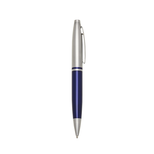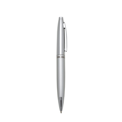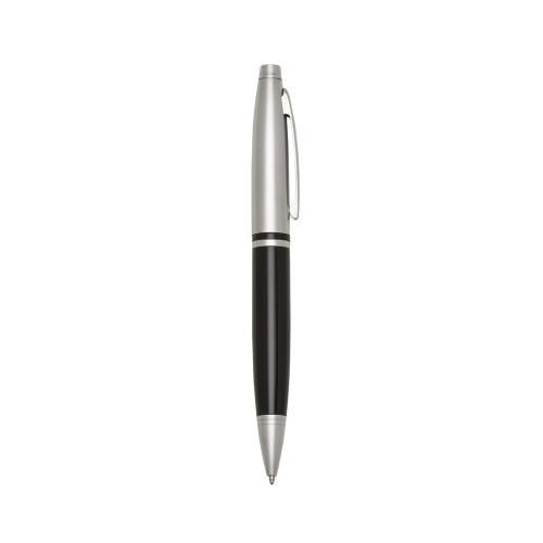 Descrição: Caneta metal prata nas versões brilhante e fosca com detalhes coloridos e dois anéis na parte superior, parte inferior em relevo. Clip metal e anel central na mesma cor da caneta, aciona por giro.