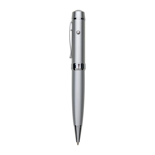 Descrição: Caneta pen drive 8GB metálica com laser e esferográfica. Clip de metal e botão do laser com lacre, ao desrosquear anel abaixo do clip abre compartimento do pen drive. Para utilizar a esferográfica basta rotacionar a ponteira. Acompanha bateria interna.