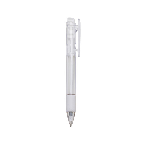 Descrição: Caneta plástica inteira transparente com detalhes emborrachado e clip coloridos. Possui dois traços vazados na parte superior e acionador com detalhes em relevo. Aciona por clique, para destravar bastar pressionar o clip.