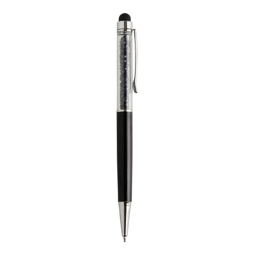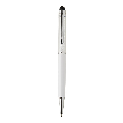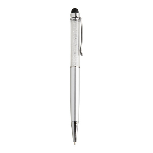 Descrição: Caneta plástica com touch screen e detalhes em cristal, acionamento por rotação e carga esferográfica azul 1mm.