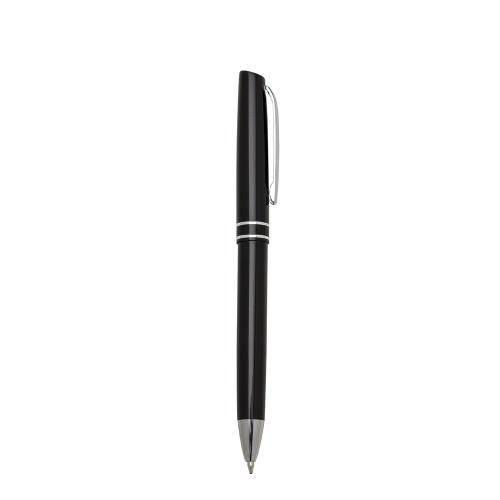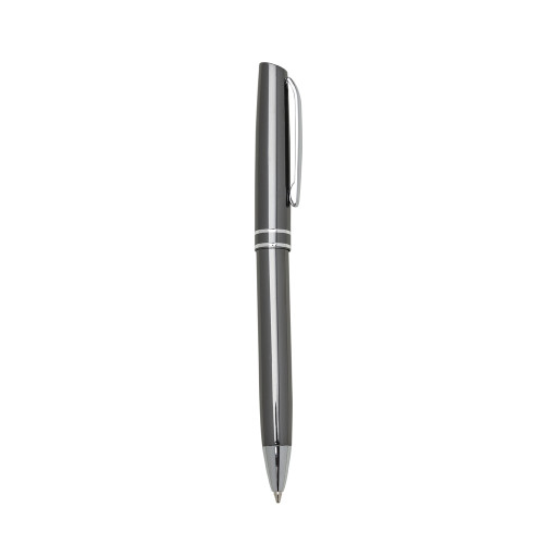 Descrição: Caneta semi-metal inteira colorida com detalhes prata. Clip metal com “ponta” superior prata e dois anéis centrais. Aciona por clique.