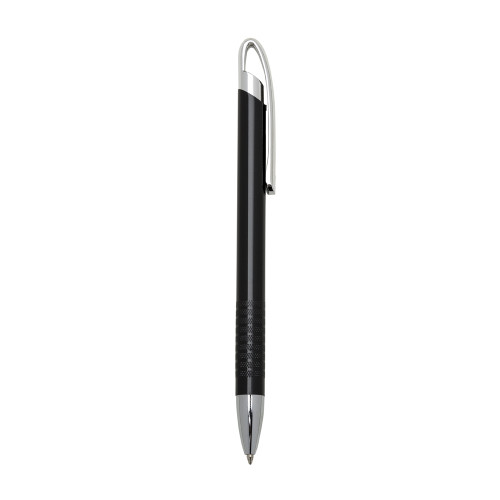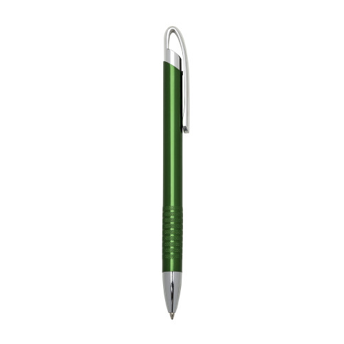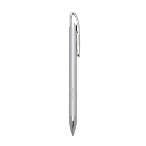 Descrição: Caneta semi-metal inteira colorida com detalhes prata. Clip metal prata e nove anéis inferiores em relevo colorido. Aciona por clique.