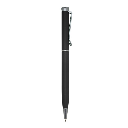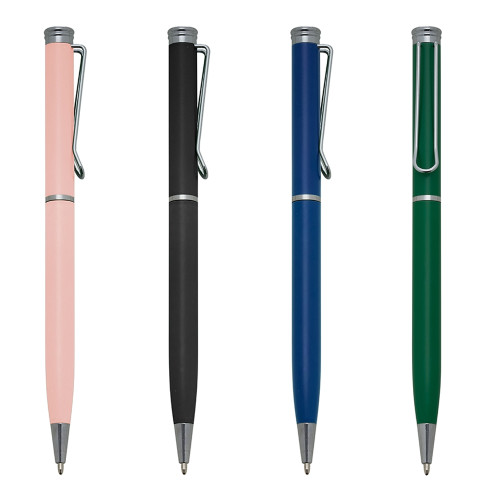 Descrição: Caneta semimetal com pintura fosca colorida e detalhes em prata. Clip metálico, acionamento por giro e carga esferográfica azul.