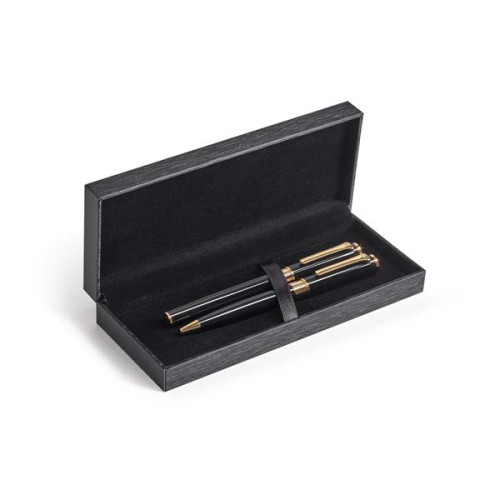 Conjunto de roller e esferográfica. Metal. Elementos com banho de ouro de 18 quilates. Esferográfica: 1,5km de escrita. Em estojo almofadado. ø12 x 136 mm | Estojo: 185 x 75 x 31 mm