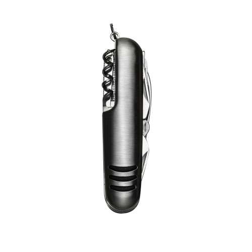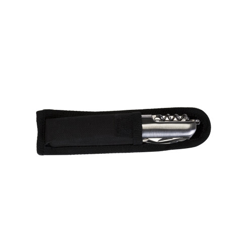Descrição: Canivete metal 11 funções com detalhes emborrachados preto(três linhas frente e verso). Possui: lâmina de corte, serrilha, serra madeira, mini tesoura, abridor de latas, abridor de garrafa, chave phillips, lamina de remoção e limpeza, lixa, agulha de sutura e saca rolhas. Acompanha bainha em nylon.