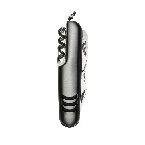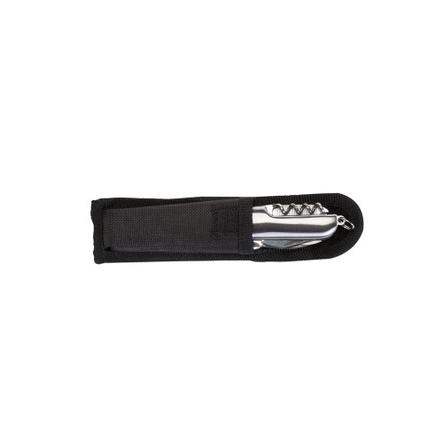 Descrição: Canivete metal 9 funções com detalhes emborrachados preto(três linhas frente e verso). Possui: lâmina de corte, serrilha, mini tesoura, abridor de latas, abridor de garrafa, chave phillips, lixa, agulha de sutura e saca rolhas. Acompanha bainha em nylon.