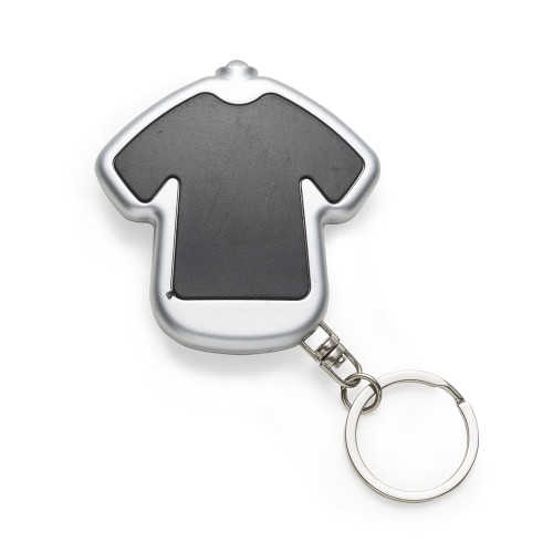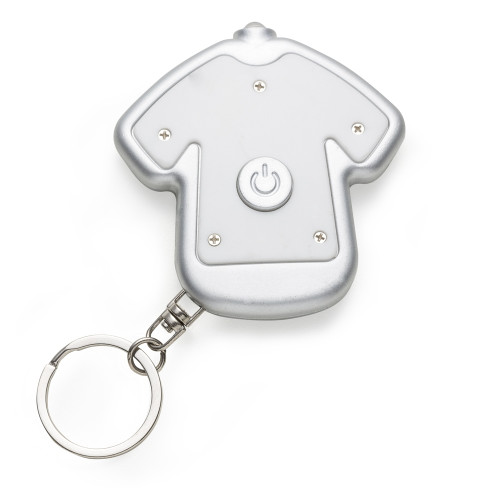 Descrição: Chaveiro lanterna plástico formato camiseta colorida com contorno prata. Frente lisa e verso com parafusos e botão para acender lanterna. Acompanha duas baterias(CR1220 e L1130).