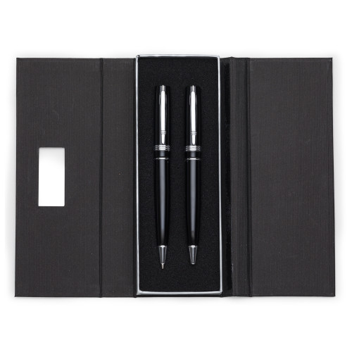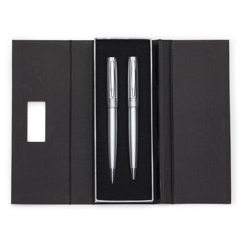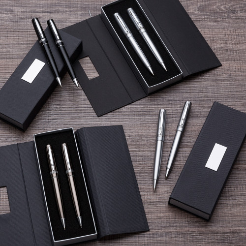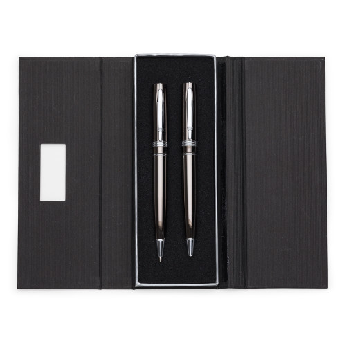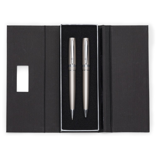 Descrição: Conjunto caneta e lapiseira em estojo de cartonagem com placa central para personalização. Caneta/Lapiseira metal inteira colorida com detalhes prata, clip metal com duas “linhas” e na “ponta” superior detalhe de uma linha no meio. Possui três anéis abaixo do clip, anel centralizado e anel inferior e acionam por giro. Estojo revestida com espuma na parte interna.
