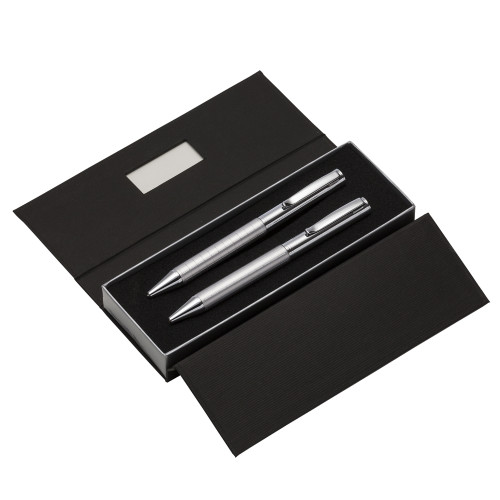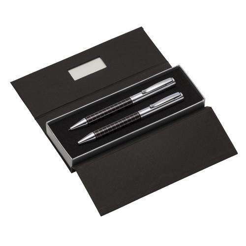 Descrição: Kit caneta e lapiseira de metal em estojo papelão com placa de metal(parte interna do estojo revestida com espuma). Caneta e lapiseira prata com detalhes coloridos e quadriculados, clip metal com anel superior na ponta e dois anéis centrais e acionam por giro.