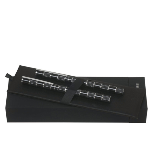 Conjunto de caneta tinteiro e roller. Metal. Caneta tinteiro: escrita a azul. Roller: escrita a preto. Fornecido em estojo de oferta. Caneta tinteiro: ø12 x 142 mm | Roller: ø11 x 142 mm | Estojo: 213 x 72 x 41 mm