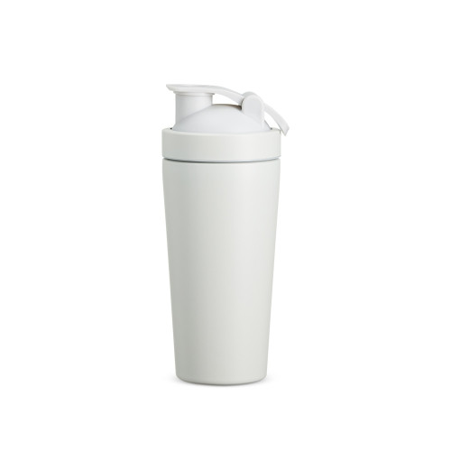 Seu design funcional conta com tampa rosqueável com trava de segurança, alça integrada flexível para melhor manuseio e misturador de mola, garantindo praticidade e eficiência no preparo de bebidas.