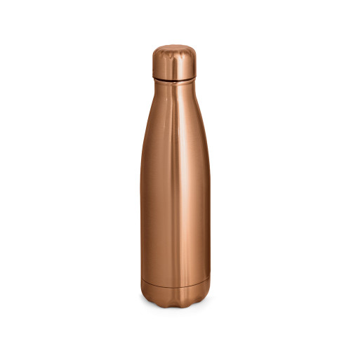 Garrafa em aço inox de parede dupla térmica, isolada a vácuo. Garrafa com acabamento metalizado e tampa em aço inox. Todas as componentes da garrafa - tampa, corpo e base - na mesma cor. Capacidade até 510 mL. Fornecido em caixa presente de papel kraft. Certificação EU Food Grade. ø70 x 255 mm